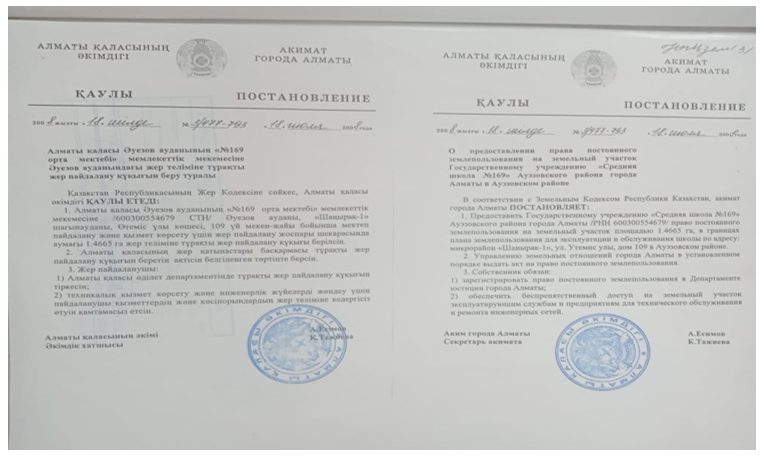 Заңды мекенжайы: 050065№ Қазақстан Республикасы , Алматы қаласы , Алатау ауданы, Шаңырақ -1 ықшамауданы, Өтемісұлы көшесі – 109 үй. Орналасқан жері: Қазақстан Республикасы , Алматы қаласы Алатау ауданы, Шаңырақ -1 ықшамауданы, Өтемісұлы көшесі – 109 үй. Жер учаскесінің кадастрлік нөмірі : 20-312-913-644, 1,4665 га. Алматы қаласы Әкімдігінің қаулысы, 18.07.2008 жылғы №3/477-793 Алматы қаласы Әкімдігінің қаулысы, шешіміне сәйкес, тұрақты жер пайдалану құқығын беретін №0384321 актісі берілген.Жер пайдаланушысы болып «Алматы қаласы Білім басқармасының «№169 мектеп-лицей мемлекеттік мекемесі бекітілген.»