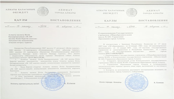 Заңды тұлға атауы/меншік нысаны: Алматы қаласы Білім басқармасының «№169 мектеп – лицей» коммуналдық мемлекеттік мекемесі. Заңды тұлға ретінде Алматы қаласы Білім басқармасының №169 мектеп – лицей» коммуналдық мемлекеттік мекемесі мемлекеттік тіркеулен Алматы қаласы Әділет департаментінде 21.08.2007жыл өткен, куәлігі №85777-1910-ММ. Мемлекеттік тіркеу туралы анықтама, мемлекеттік тіркеу уақытысы: 2011 жылғы 20 желтоқсан күні Алматы қаласының білім саласында сапаны қамтамасыз ету департаменті №0163405 бастауыш білім, негізгі орта білім және жалпы орта білім беру қызметімен айналысуға мемлекеттік бас лицензия шексіз мерзімге берілген. Пайдалануға берілген жылы: 2008 жыл