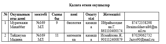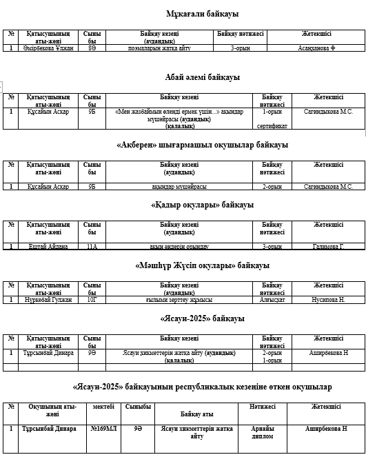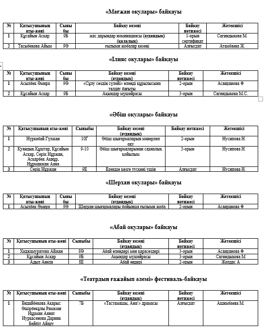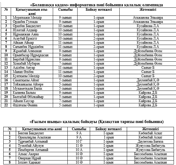 2020 ж. қазақ тілі мен әдебиеті пәнінен қалалық олимпиадада 9-сынып оқушысы Мешитбаева Аружан ІІІ орын иеленді; 2020 жылы 6-сынып оқушысы Сағынбек Нұрдінбек «Зерде» қалалық ғылыми жобалар конкурсына қатысып, І дәрежелі дипломмен, ал республикалық сайыста жүлделі ІІІ дәрежелі дипломмен марапатталды. 2020-2021 оқу жылында 10-сынып оқушысы Рашит Фарида шығармашыл оқушылар арасындағы VII республикалық «Ақберен» өнер байқауына қатысып, «Ақындар мүшәйрасы» номинациясы бойынша қалалық кезеңнен Бас жүлде алса, республикалық кезеңде ІІІ дәрежелі дипломға ие болды. Аталған оқу жылында 10-сынып оқушысы Рашит Фарида орта білім ұйымдарының 5-11-сынып оқушылары арасында ұйымдастырылған «Айтыс – сөздің майданы» атты қалалық жас ақындар айтысында ІІІ орынды иеленді. 2021-2022 оқу жылында 10-сынып оқушысы Өмірбай Жадыра «Дарын» ғылыми жоба конкурсының қалалық кезеңінен І орын, республикалық кезеңінен ІІІ орын иеленді. 11-сынып оқушысы Рашит Фарида Қ.Бітібаева атындағы қазақ тілі мен әдебиеті пәні бойынша өткен олимпиаданың қалалық кезеңінен ІІ орын, республикалық кезеңінен І орын иеленді. 2022-2023 оқу жылында 11-сынып оқушысы Өмірбай Жадыра Қ.Бітібаева атындағы қазақ тілі мен әдебиеті пәні бойынша өткен олимпиаданың аудандық кезеңінен І орын, қалалық кезеңінен ІІ орын алып, Өскемен қаласында өткен республикалық кезеңіне қатысып, ІІІ орын иеленіп келді. 9-сынып оқушысы Кенесбекова Анель республикалық «Тіл – құндылық» байқауына қатысып, ІІІ орын иеленді. 2023-2024 оқу жылында 10-сынып оқушысы Бекберген Ақниет республикалық «Ақбота» зияткерлік олимпиадасына қатысып, ІІІ орын иеленді, 8 «Ә» сынып оқушысы Ахметжан Жанель аудандық «Мағжан оқуларына» қатысып, ІІІ орын иеленді. 11 «Ә» сынып оқушысы Бердаулет Айназ «Қ.Сәтбаев және бүгінгі Қазақстан» тақырыбындағы эссе байқауының аудандық кезеңінен І орын алып, қалалық кезеңде сертификатқа ие болды. 2024-2025 оқу жылында 9 «Ә» сынып оқушылары Асылбек Әмира, Акетай Мағжан республикалық «Ақбота» зияткерлік олимпиадасына қатысып, ІІ орын иеленді; 9 «Ә» сынып оқушысы Тұрсынбай Динара «Ясауитану-2025» байқауының аудандық кезеңінен ІІ орын, қалалық кезеңінен І орын иеленіп, республикалық кезеңнен арнайы дипломмен марапатталды.