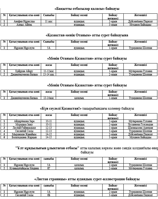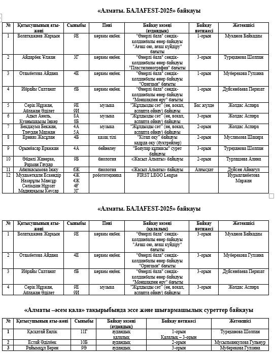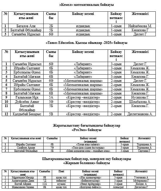 3.Оқу ағарту министрлігінің №514 бұйрығына сүйене Республикалық «Ustaz enbegi» ғылыми әдістемелік журналының ұйымдастыруымен 2024-2025 оқу жылының қазан айындағы «Ілияс оқулары» байқауына қатысып жүлделі 1-орын иеленгені үшін Мусабай Балым марапатталады. Жетекшісі:Касенова Динара Ерланкызы
