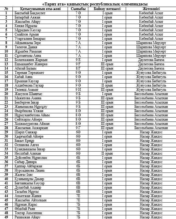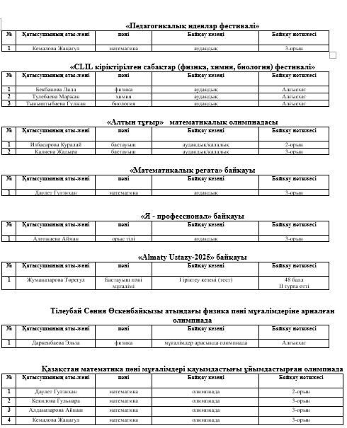 1. Алмагамбетова Патшагуль Онгарбаевна - мектеп директоры2. Жалпы еңбек өтілі- 32 жыл ,тарих пәні мұғаліміАлғыс хат «АМАНАТ» партиясы 2022ж.Құрмет грамотасы «Ұстаз»АҚЖКО-ның төрағасы2022ж. Алғыс хат «Қасым-Жомарт Тоқаевты қолдау жөніндегі халықтық коалиция» 2022ж. Алғыс хат «АМАНАТ» партиясы 2023ж. Алғыс хат «BILIM-ORKENIETI» Ұлттық инновациялық ғылыми-зерттеу орталығы 2023ж. Алғыс хат «Алматы қаласы музейлер бірлестігінің» КМҚК 2023ж . Алғыс хат Казахский автомобильно-дорожный институт им. Л.Б..Гончарова 2023ж.Құрмет грамотасы Алматы қаласы Білім басқармасы Қалалық білім берудегі жаңа технологиялардың ғылыми-әдістемелік орталығы 2024ж. Диплом Қанипа Бітібаева атындағы Республикалық ғылыми-әдістемелік зерттеу орталығы 2023ж.Алғыс хат ҚазҰПУ ректоры 2024ж. Құрмет грамотасы «Өрлеу» біліктілікті арттыру Ұлттық орталығы» АҚФ 2025ж.Алғыс хат Алатау ауданы әкімінің орынбасары 2025ж. Сертификат «ТМД» елдері бойынша білім жүйесін дамытудың халықаралық қоры» 2023ж.Сертификат «Адамның үйлесімді даму ұлттық институты» коммерциялық емес акционерлік қоғамы 2023ж.Сертификат Қанипа Бітібаева атындағы Республикалық ғылыми-әдістемелік зерттеу орталығы Қанипа Бітібаева атындағы Республикалық ғылыми-әдістемелік зерттеу орталығы 2023ж. Сертификат «Адамның үйлесімді дамуы Ұлттық институты» коммерциялық емес акционерлік қоғамы 36 академиялық сағат 2023ж.Сертификат «ТМД елдері бойынша білім жүйесін дамытудың халықаралық қоры» қоғамдық қоры 104 сағат 2023ж.CERTIFICATE OF COMPLETION Cingapore 2023;APPENDIX Cingapore 2023. CERTIFICATE OF ATTAINMENT 2024ж. Сертификат ҚР Оқу-ағарту министрлігі Республикалық «ДАМУ» педагогикалық-психологиялық дамыту орталығы 2024ж. Сертфикат Абай атындағы Қазақ ұлттық педагогикалық университеті 2024ж. Сертфикат «Тиімді басқару нұсқаулығы: Тәжірибе. Стратегия.Әрекет» форум 2025ж. CERTIFICATE «ASES» ACADEMY OF PARTICIPATION турция 72 сағат 2025ж.