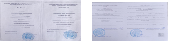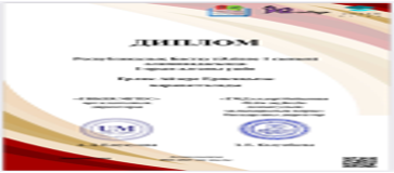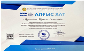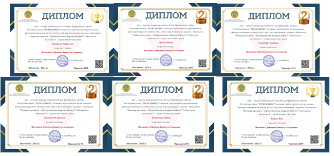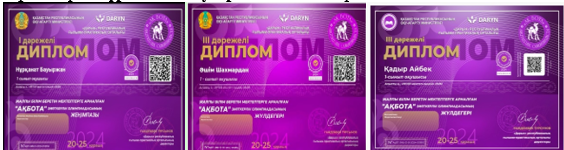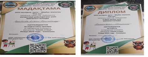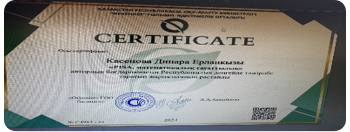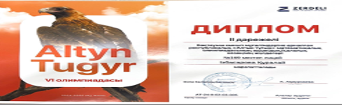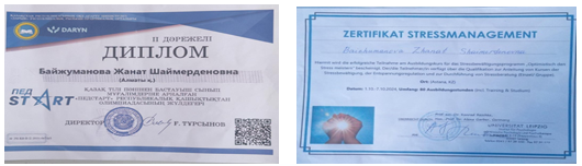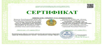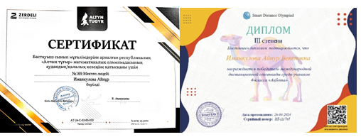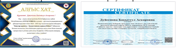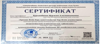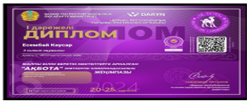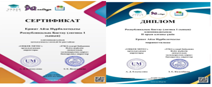 Диплом «Ustaz Tilegi» Республикалық ғылыми-әдістемелік орталығы 2025 ж. ж. Сертификат Абай атындағы Қазақ Ұлттық педагогикалық университеті 2025 ж.