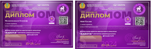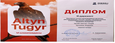 «ДАРЫН» Республикалық Ғылыми-Практикалық орталығы. Жалпы білім беретін мектептерге арналған «Ақбота» зияткерлік олипиадасының III-ші дәрежелі диплом жүлдегері. Қадыр Айбек 20-25 қараша 2024ж