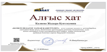 Қазақстан Республикасының жалпы орта білім беру мекемелерінің бастауыш сынып мұғалімдерінің біліктіліктерін арттыруда «БАСТАУЫШ МЕКТЕП ПӘНДЕРІНІҢ КҮРДЕЛІ ТАҚЫРЫПТАРЫН МЕҢГЕРУ ИНКЛЮЗИВТІ БІЛІМ БЕРУДІ ДАМЫТУ» тақырыбында 80 академиялық сағат көлемінде толық оқыту курсын аяқтады.