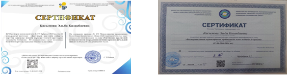 Сертификат «Пелагогтардың цифрлық құзырлығын дамыту» 2021ж. Сертификат Қазақстан Республикасы Білім және Ғылым министрлігі «Өрлеу» БФҰО» АҚ филиалы Алматы қаласы бойынша ПҚ БАИ. 120 академиялық сағат. 2022ж. Құрмет грамотасы.2023ж.Сертификат Қазақстан Республикасы оқу-ағарту министрлігі «Өрлеу» Біліктілікті арттыру ұлттық орталығы» Акционерлік қоғамы .80 академиялық сағат.2024ж