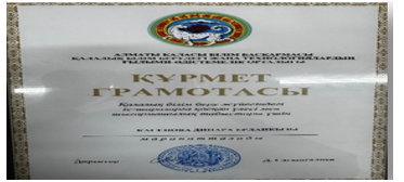 Мұғалім жетістіктері: Алматы қаласы білім басқармасы қалалық білім берудегі жаңа технологиялардың ғылыми әдістемелік орталығы. ҚҰРМЕТ ГРАМОТАСЫ Қалалық білім беру жүйесіндегі іс-шараларға қосқан үлесімен шығармашылық табыстары үшін