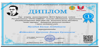 1. «Педстарт-2024» атты III Республикалық байқауына «бастауыш сынып мұғалімдеріне арналған республикалық қашықтықтан олимпиадасының Диплом 2-орын
