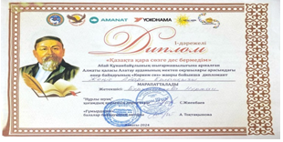 5. 1-дәрежелі ДИПЛОМ «Қазақта қара сөзге дес бермедім» Абай Құнанбайұлының шығармашылығына арналған Алматы қаласы Алатау ауданы мектеп оқушылары арасындағы өнер байғауының «КӨРКЕМ СӨЗ» жанры бойынша дипломант Жеңіс Айару марапаталады Алматы-2024 жыл