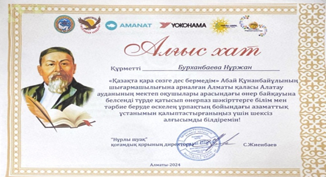 6. Қазақстан Республикасының оқу-ағарту министрлігі Республикалық «Мақатаев оқулары» конкурсы « Мың бала» зияткерлік орталығынан АЛҒЫС ХАТ Бурханбаева Нуржан Алымакыновнаға 02.12.2024 ж MOJ- 014346 Астана қаласы-2024 жыл