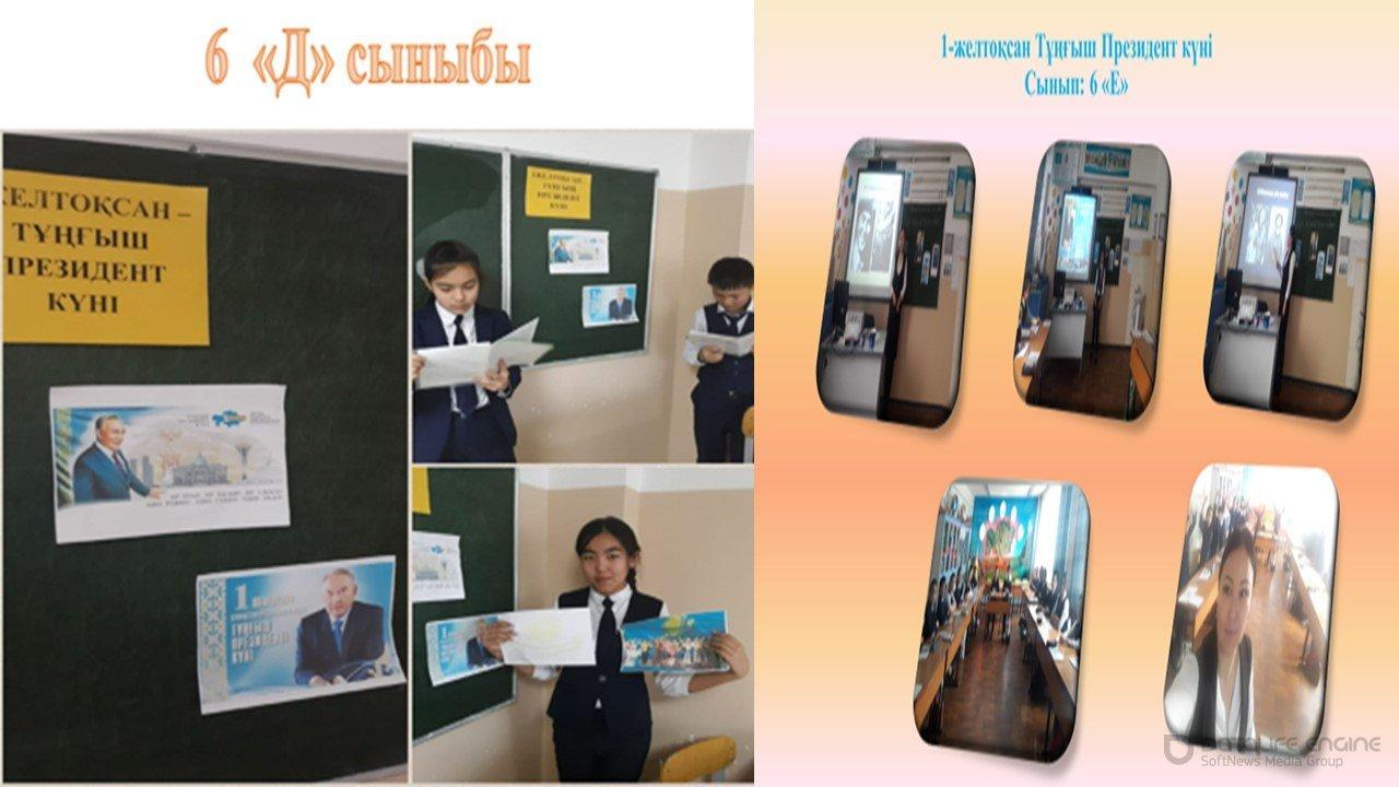 Атап айтар болсақ, мекебіміздің І қабатына «1-желтоқсан Тұңғыш Президент күні» атты стенд және қабырға банері шығарылыды. Ал 1-11 сыныптар арасында «Елін сүйген Елбасы» тақырыбында сынып сағаттары өткізілді. Оқушыларға Президентіміз Н.Ә.Назарбаевтың өмір жолы мен еңбек еңбек жолында атқарған келелі істерімен таныстырылды.Н.Ә.Назарбаев бәрінен бұрын өз міндетін,өз тағайындалуын терең сезінетін, үлесіне тиген міндетті жауапты әрі қажырлықпен атқаратын тұлға екендігін айтып өтті.