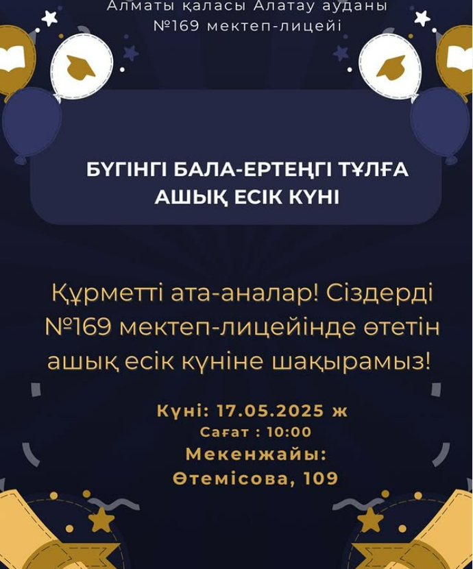 Школа 169 » Ақпарат » “Бүгінгі бала-ертеңгі тұлға” тақырыбында ашық есік күніне шақырамыз!
