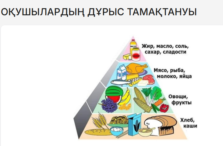 Мектеп жасындағы балаларға дәрумендер мен микроэлементтерге бай теңгерімді тамақтану қажет, бұл олардың денесінің дамуына және сау болуына көмектеседі.