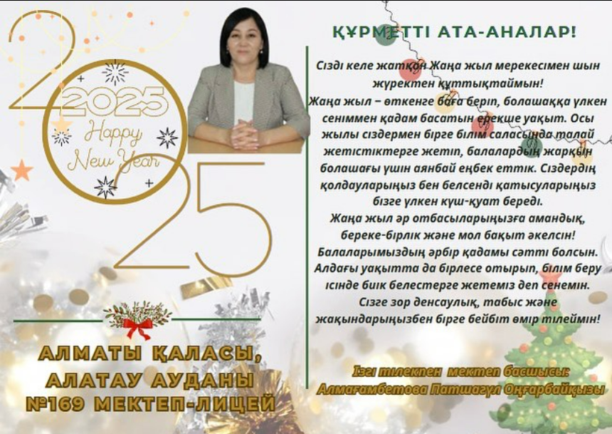 169 мектеп-лицейінің директоры Алмаганбетова Патшагүл Онгарбаевна келе жатқан Жаңа 2023 жылға құттықтау тілегі! Жаңа жылда жағымды жаңалықтар мен теле