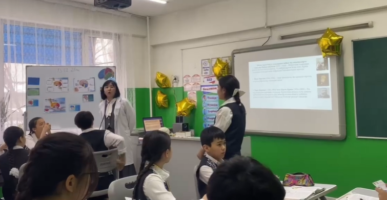 Алматы қаласы №169 мектеп-лицейінің биология пәнінің мұғалімі Турлашева Алина Маратовна 7 «Ғ» сынып оқушыларына ашық сабақ өткізілген сәтінен видео Тақырыбы: «Ми. Үлкен ми сыңары»🧠 Оқу мақсаты: 7.1.7.4 - Орталық жүйке жүйесі бөлімдерінің құрылысы мен қызметтерін салыстыру