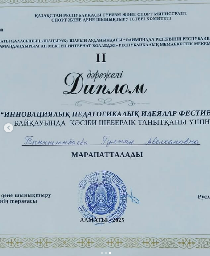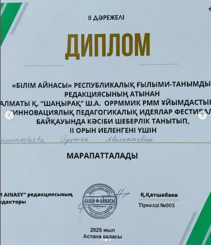 16.05 күні Алматы қаласы ОРРММИК РММ ұйымдастыруымен мектеп, колледж мұғалімдерінің арасында “Инновациялық педагогикалық идеялар фестивалі” болып өтті. Аталған байқауға №169 мектеп-лицейінің биология пәні мұғалімі Тыныштыбаева Гулжан қатысып, “Жасыл мектеп” тақырыбындағы жаңашыл идеясымен бөлісті. Жұмыс әділқазы тарапынан жоғары бағаға ие болды. Тыныштыбаева Гулжан Авелкановна байқауда кәсіби шеберлік танытқаны үшін ІІ дәрежелі дипломмен марапатталды. Еңбегіңіз жана берсін! Биіктерден көрініңіз!💐💐 #біртұтас_тәрбие #біртұтас_тәрбие_алматы #біртұтас @akimat_alatau @alatau_bilim_bolimi @talgat.malybaev @almaty_birtutas_tarbie @birtutas_tarbie2024